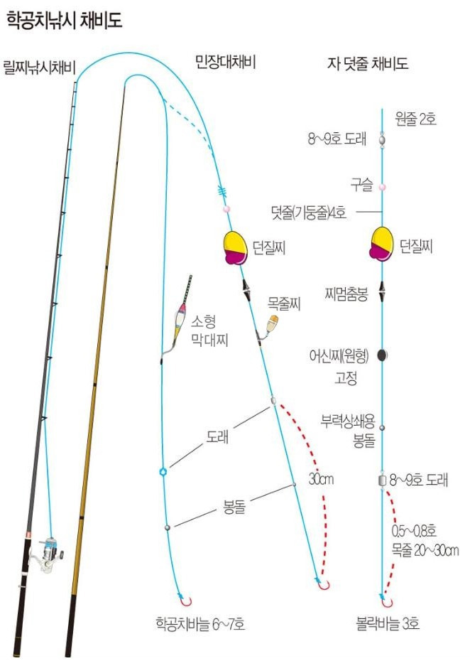 학꽁치 채비는 간단하지만 디테일이 중요한 분야입니다. 대표적인 채비 구성은 다음과 같습니다.